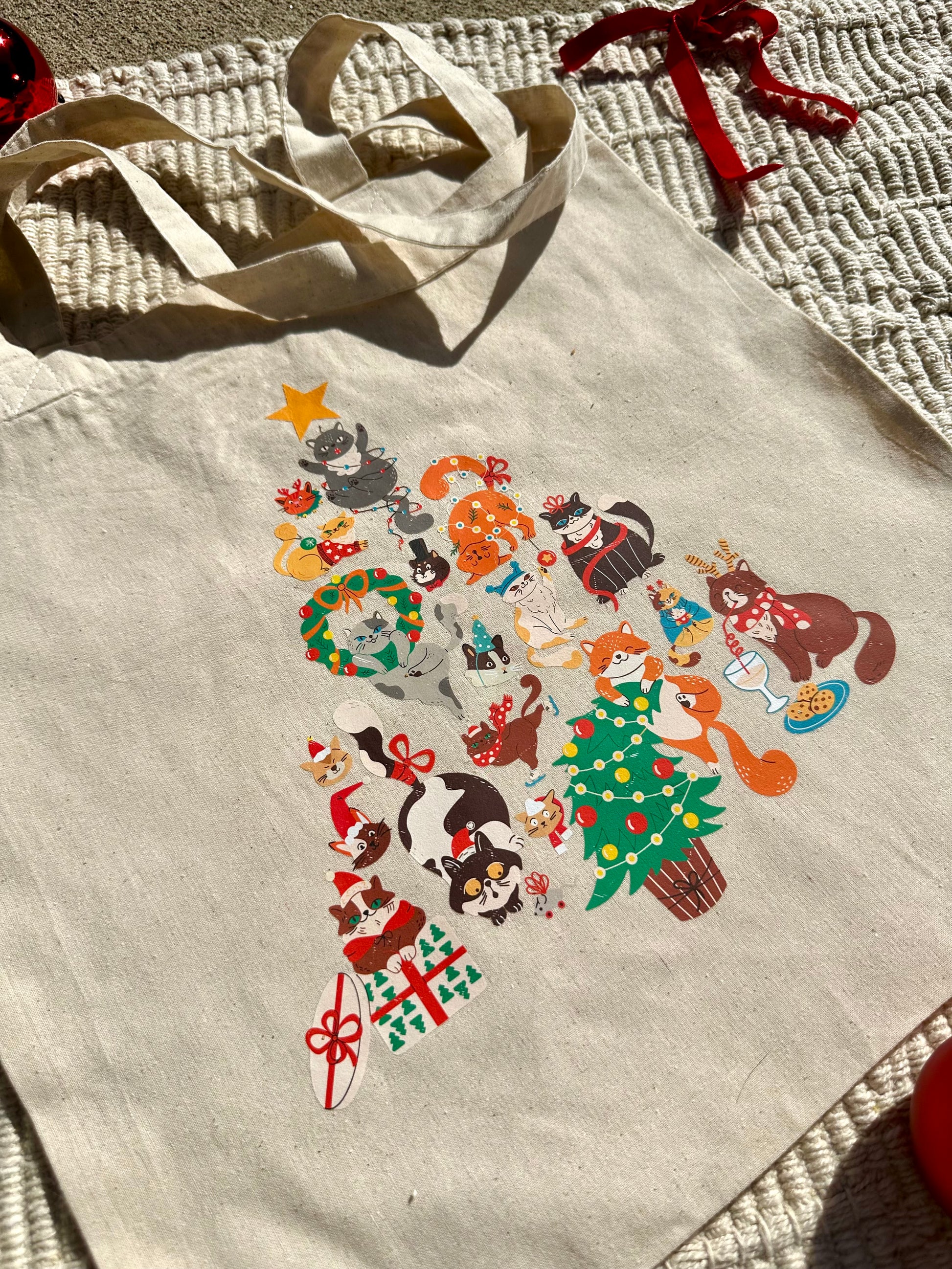 Recyclable flat tote with a cute cat Christmas Tree DTF print