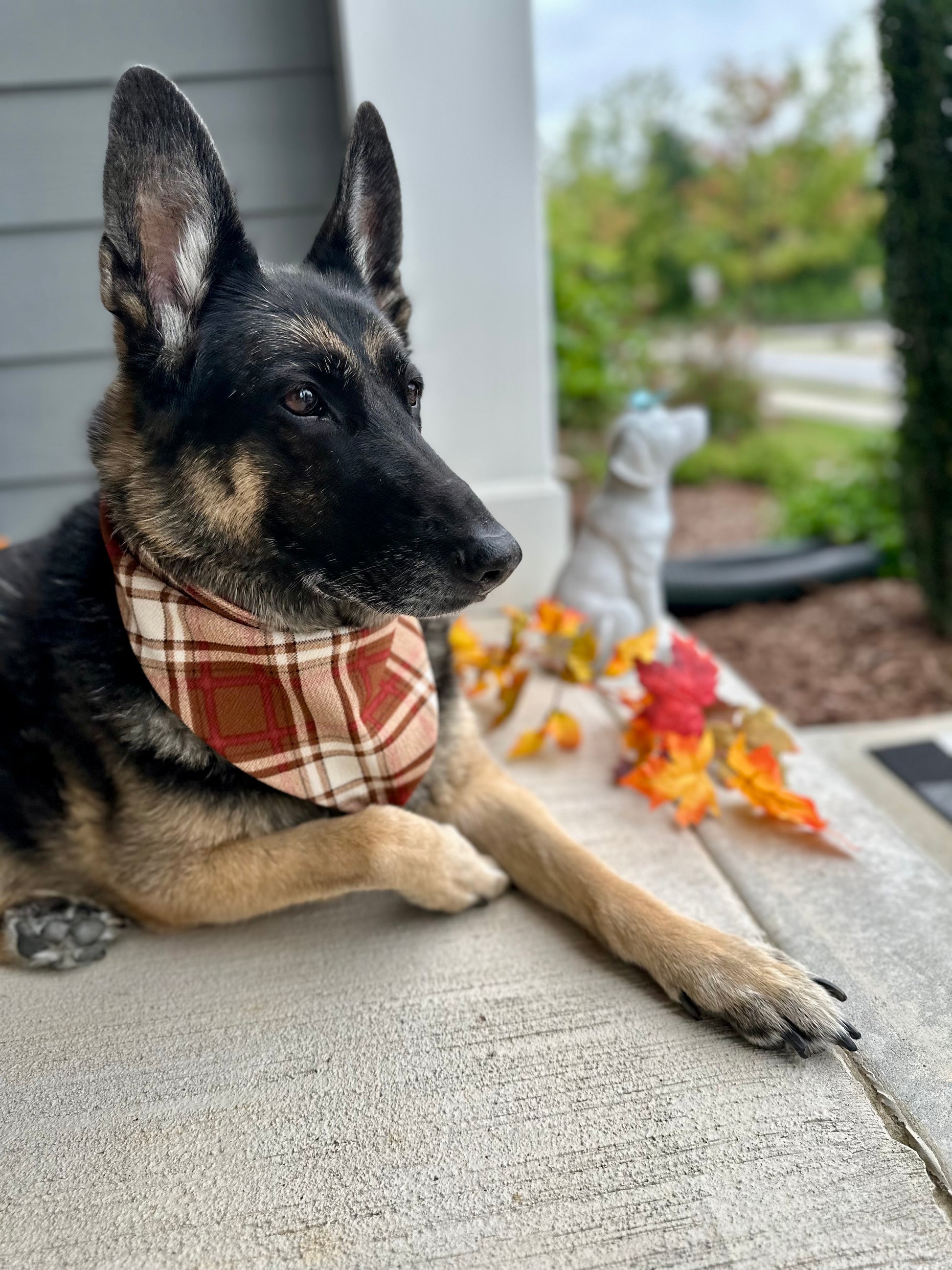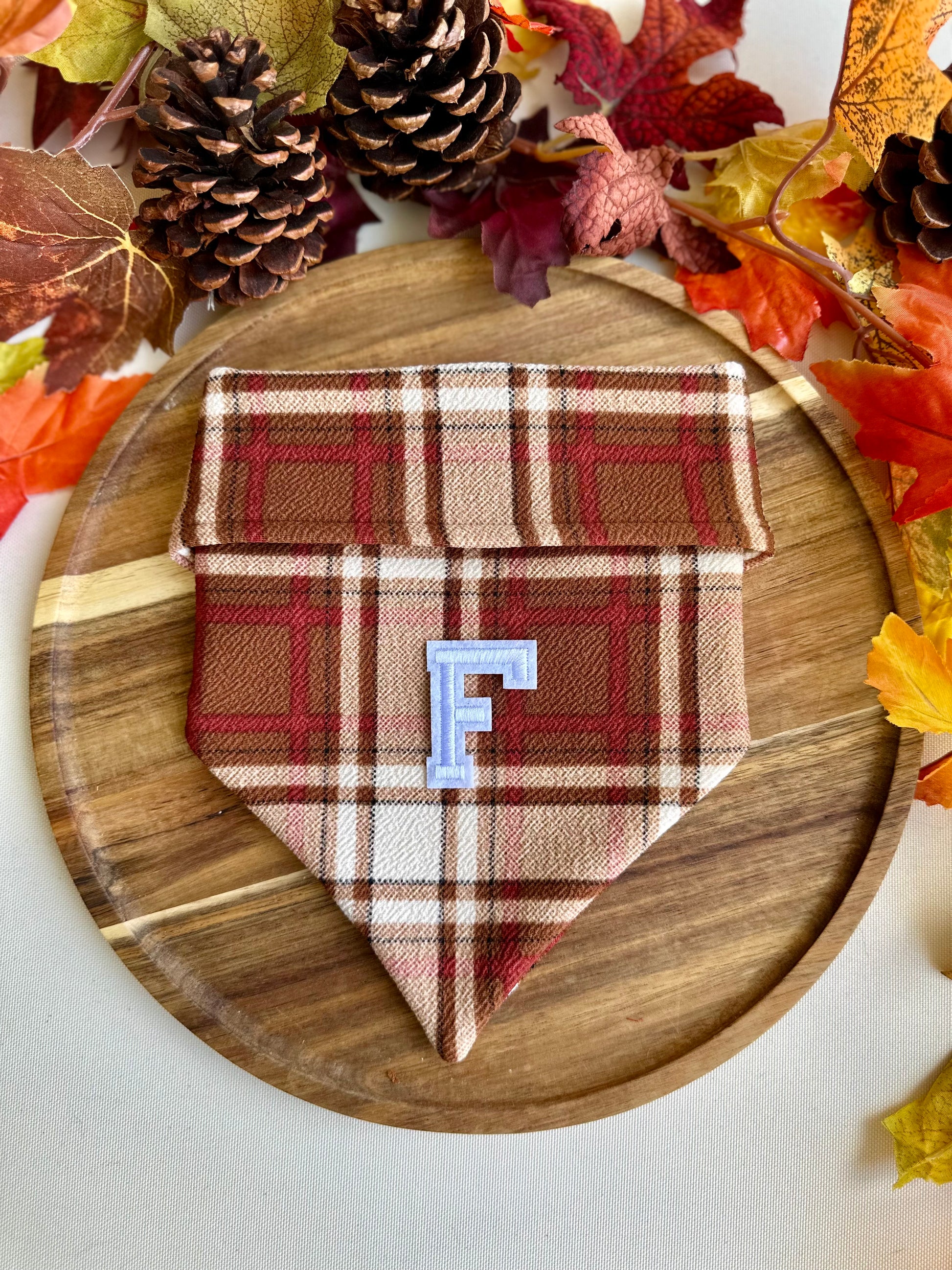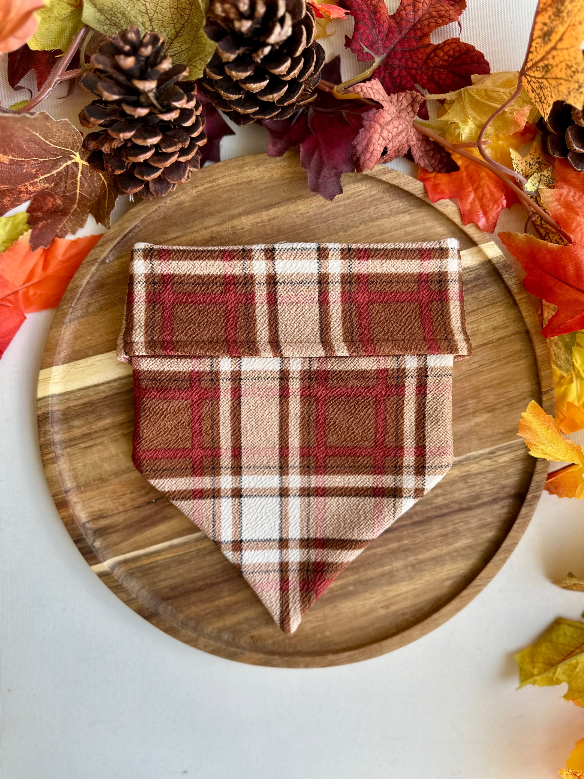 Our Cinnamon Trail bandana features a brown, cream and red plaid print with the perfect amount of stretch and comfort for your pet.