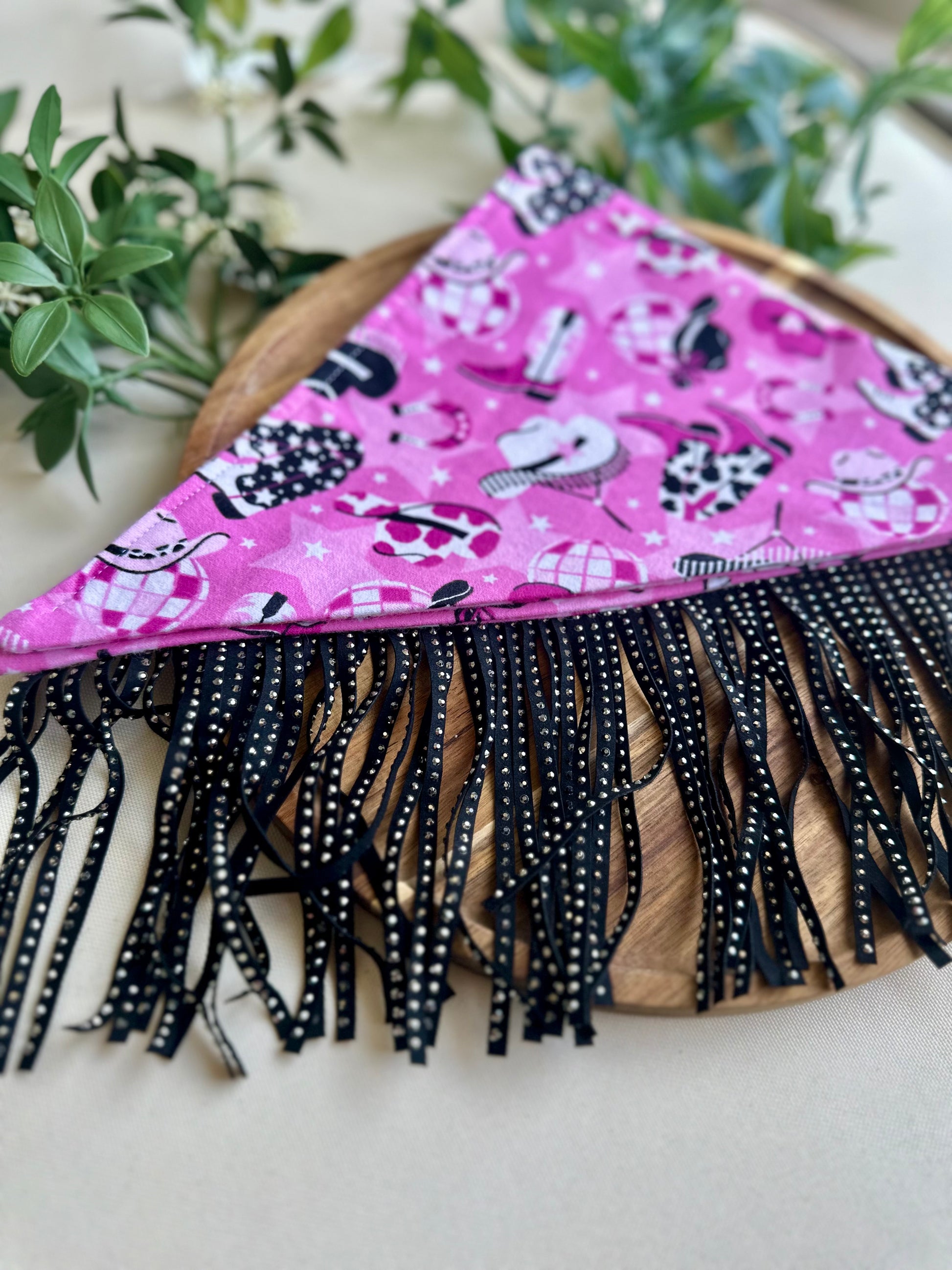 Add this black faux leather rhinestone fringe trim to any bandana to make a statement for your pet!
