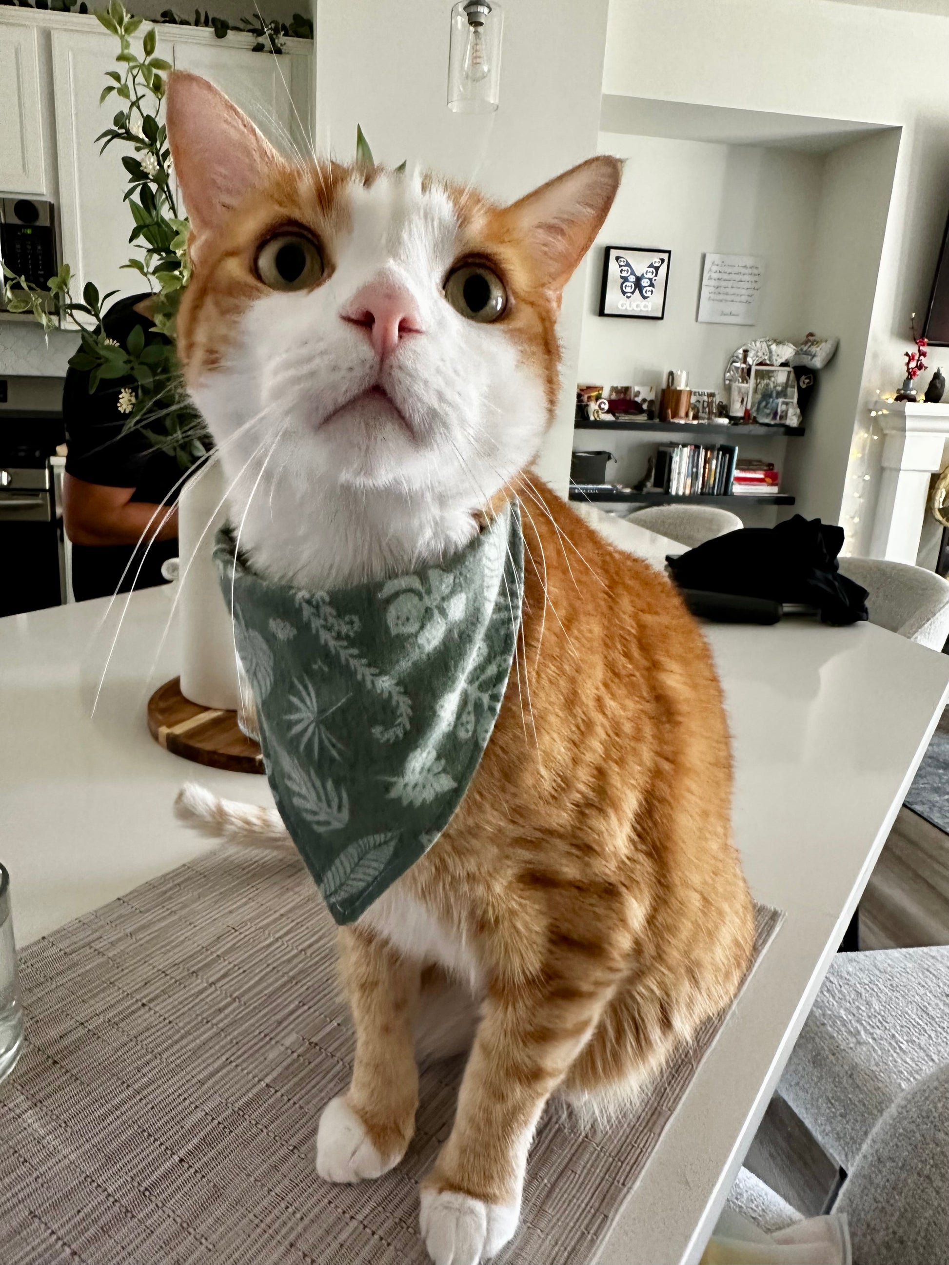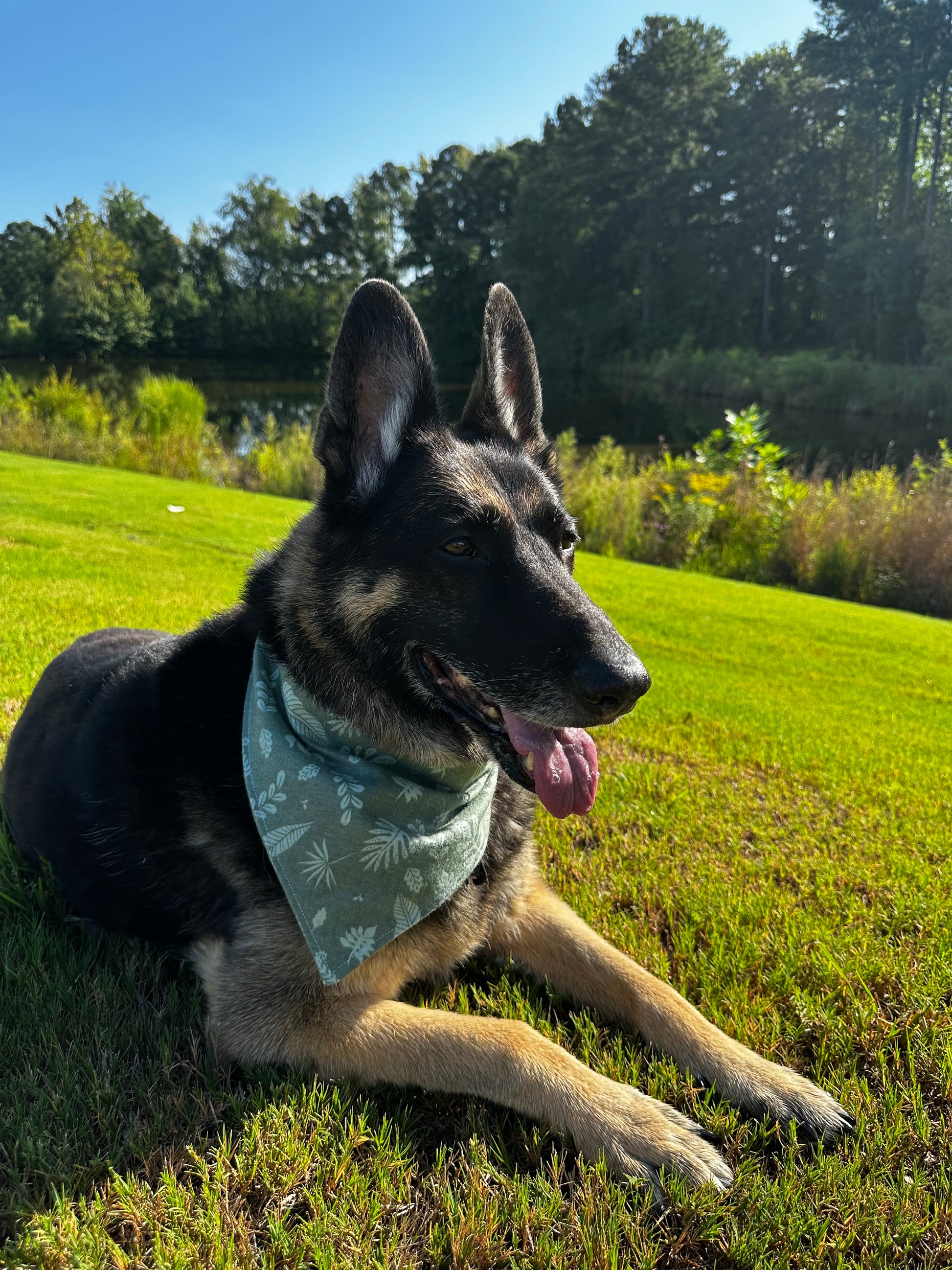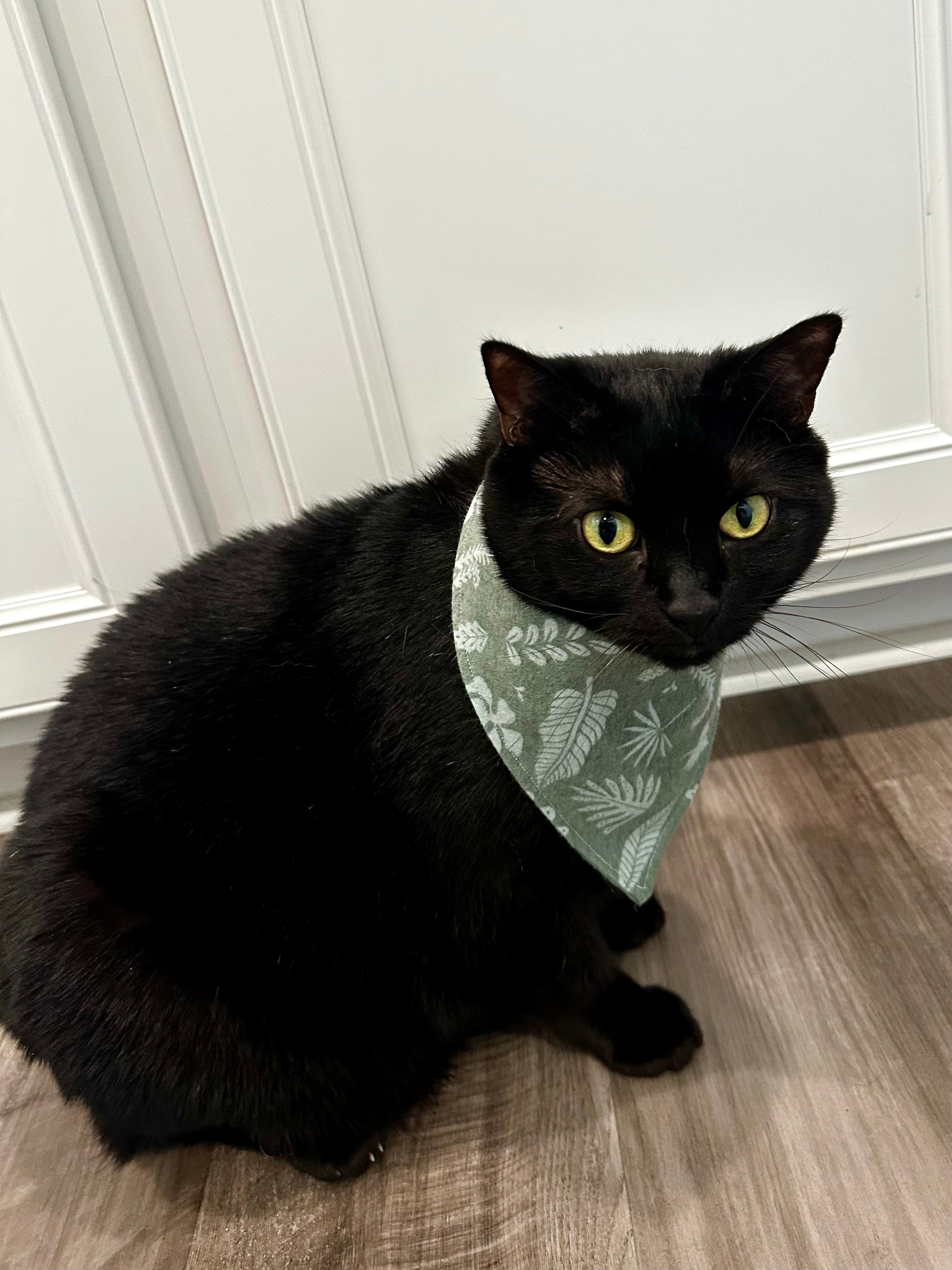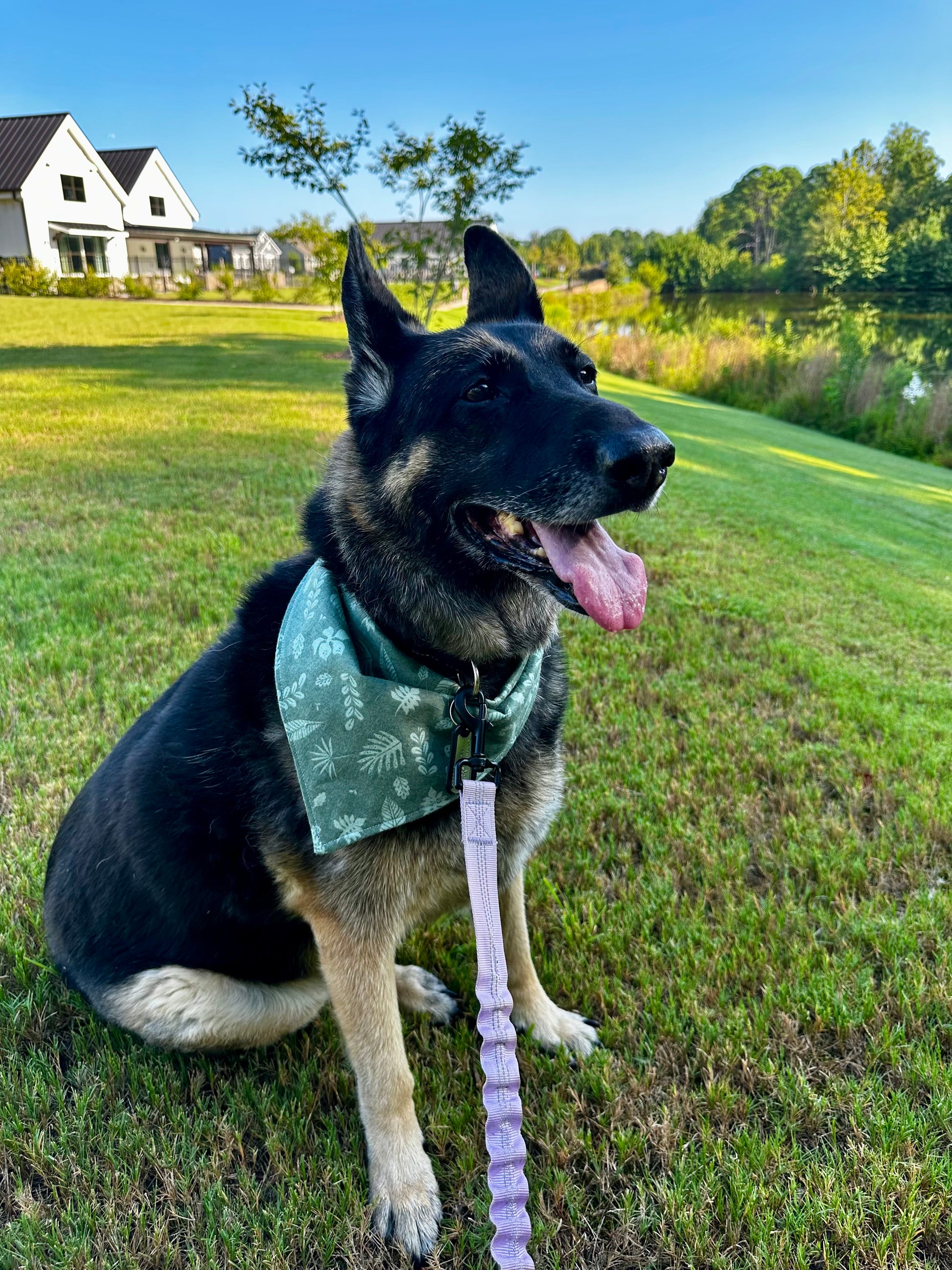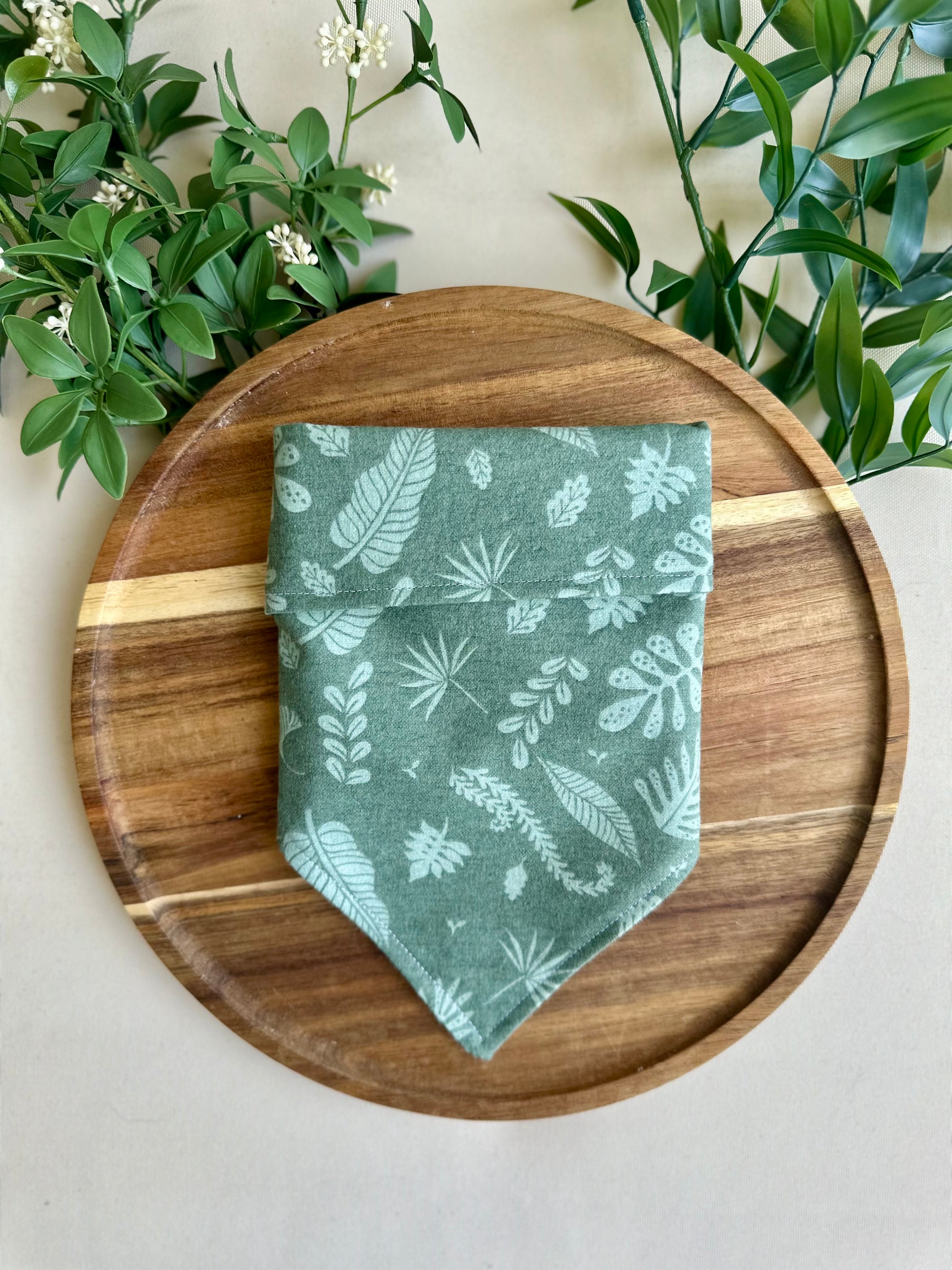 Leaf Me Be is a soft sage bandana with a boho leafy print made from organic cotton knit for plant-loving pups and kitties who enjoy the peaceful life!