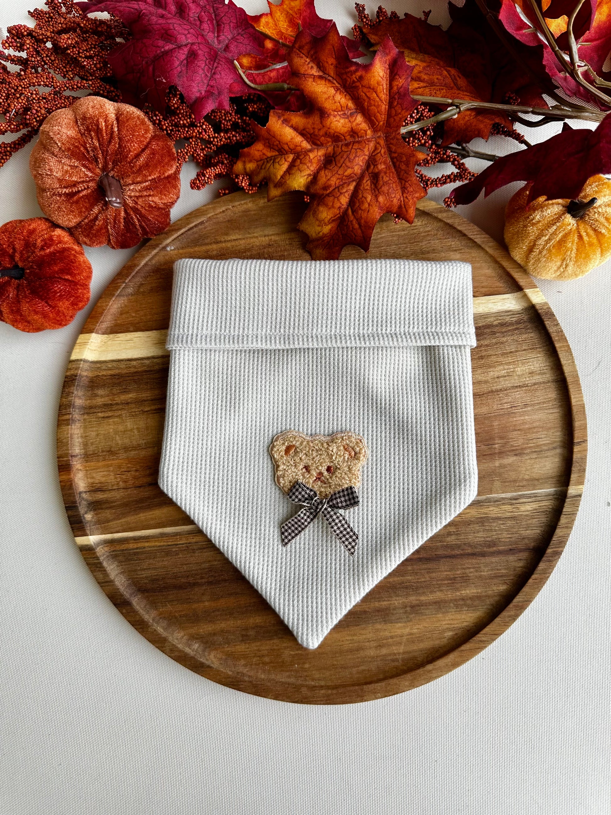 Our classic Vanilla Bean knit bandana but with a cute teddy patch and bow! You can select which variation you like to customize it.